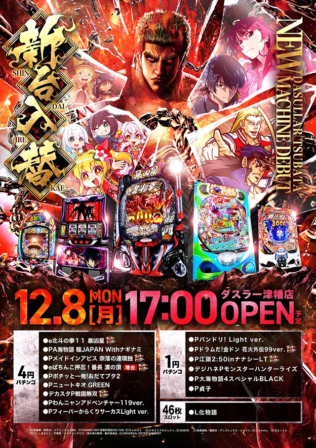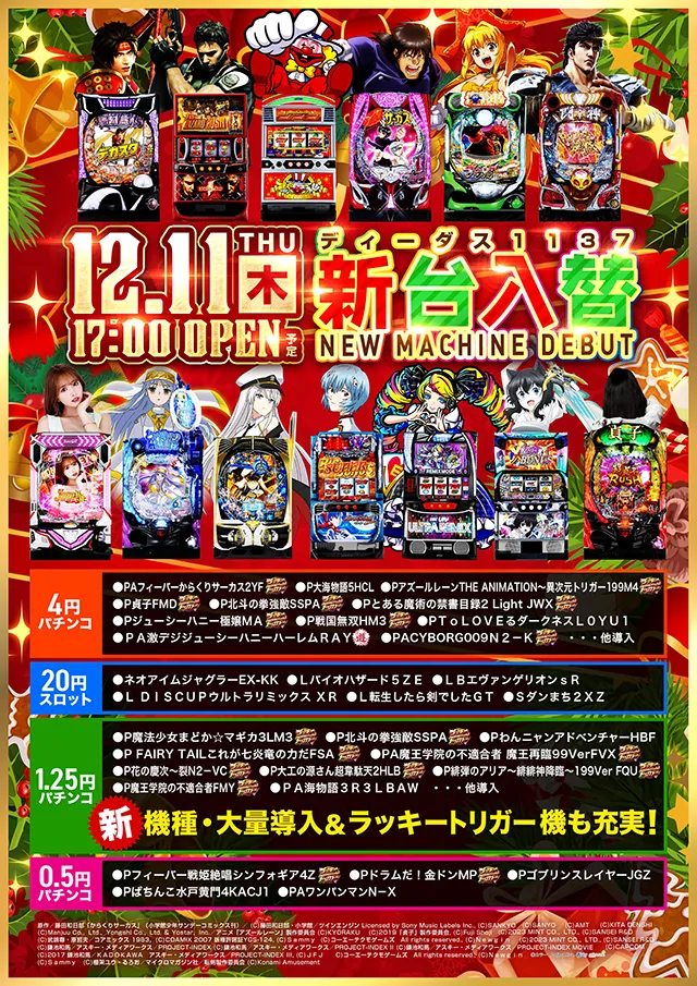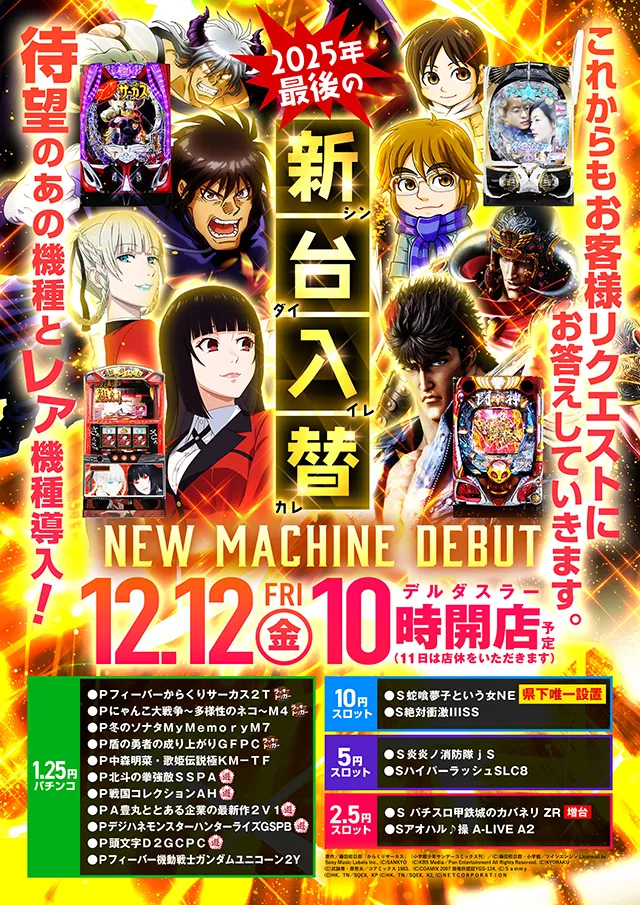 ダスラー特設 | 石川エリアのパチンコ・パチスロ最新機種・取材 2025.12.06 北陸 石川県 ダスラー ダスラーグループ 全店5日一斉開店 北陸 石川県 ダスラー ダスラーグループ 全店15日一斉開店 北陸 石川県 ダスラー ダスラーグループ 全店25日一斉開店 ダスラー新台入替情報開店時間や閉店時間が変更になる日程がございますのでご注意ください。 ダスラー津幡 デルダスラー ディーダス1137 取材情報 ダスラー津幡 デルダスラー ディーダス1137 各店舗のご案内 ディーダス1137 P-WORLD ブログ Twitter LINE 津幡ダスラー P-WORLD ブログ Twitter LINE デルダスラー P-WORLD ブログ Twitter LINE