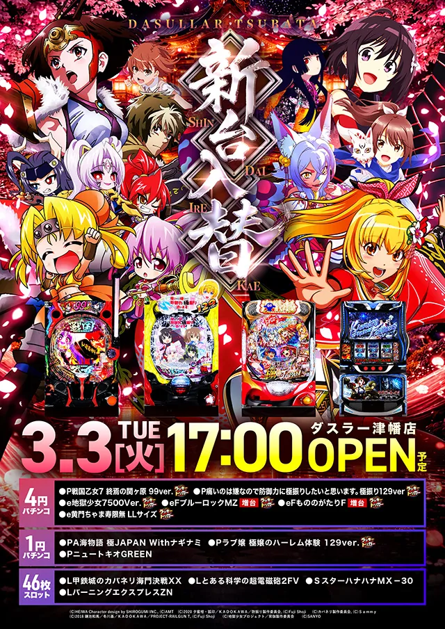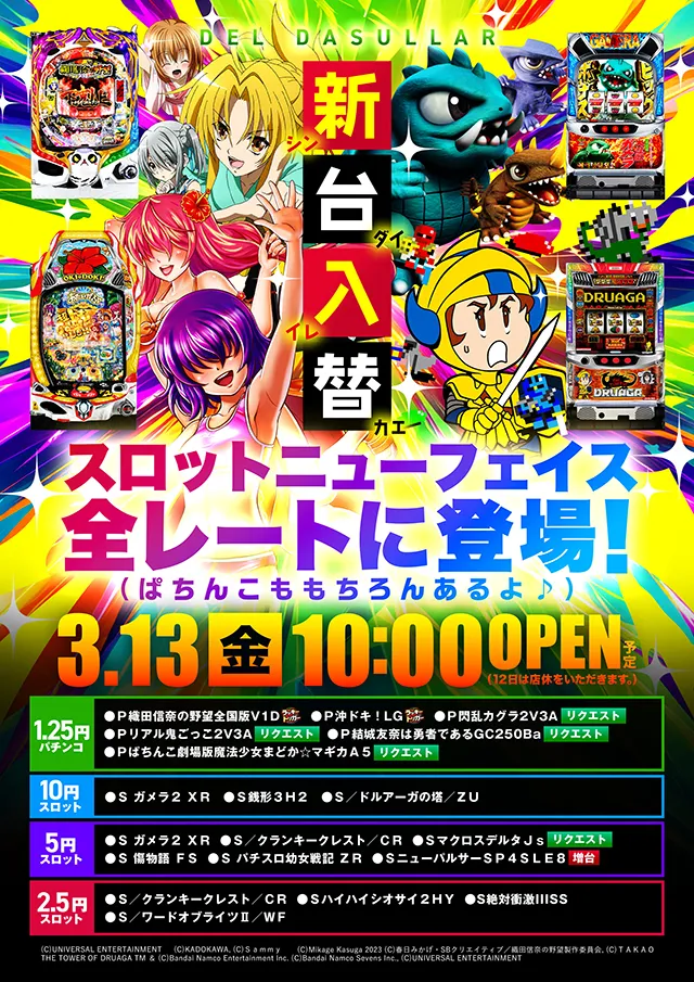 ダスラー特設 | 石川エリアのパチンコ・パチスロ最新機種・取材 2026.03.13 北陸 石川県 ダスラー ダスラーグループ 全店5日一斉開店 北陸 石川県 ダスラー ダスラーグループ 全店15日一斉開店 北陸 石川県 ダスラー ダスラーグループ 全店25日一斉開店 ダスラー新台入替情報開店時間や閉店時間が変更になる日程がございますのでご注意ください。 ダスラー津幡 デルダスラー ディーダス1137 取材情報 ダスラー津幡 デルダスラー ディーダス1137 各店舗のご案内 ディーダス1137 P-WORLD ブログ Twitter LINE 津幡ダスラー P-WORLD ブログ Twitter LINE デルダスラー P-WORLD ブログ Twitter LINE